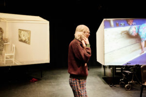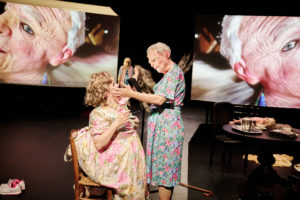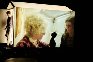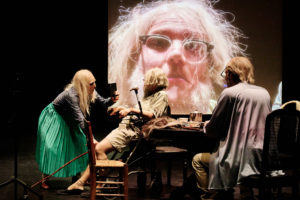 En m’attaquant à la question du vieillissement et de la mort, j’aurais pu concevoir une pièce sur la façon dont nous organisons la fin de vie dans nos sociétés utilitaristes et libérales, sur les établissements médicalisés, la sociologie de la mort, le sénilité, etc. Je me suis bien sûr documenté sur tout ça. Mais à mesure que nous écrivions collectivement et que nous répétions L’âge de frémir, j’ai compris ce qui m’intéressait vraiment dans le fait de représenter sur scène des vieillardes et des vieillards… Davantage que de simples « pré-cadavres » ambulants, d’autres présences ont surgi derrière leurs rides, leurs tremblements, leurs oublis et leurs petites infirmités. Comme des chamans, ils et elles ont fait apparaître les fantômes de celles et ceux que j’ai perdus, ou que les personnes que j’aime ont perdus, les êtres « pas encore nés » qui m’accompagnent fantasmatiquement, les ancêtres lointains dont je porte les gènes et dont les affects m’ont été transmis, ou d’autres absents que je fréquente plus ou moins assidument. Car nous entretenons toutes et tous (parfois même sans nous en rendre compte) des interactions réelles ou imaginaires avec quantité d’êtres invisibles et impalpables. Qu’ils soient vieux, jeunes ou sans âge, peu importe : ils agissent sur nous, en travaillant nos gènes, nos souvenirs, nos fictions, nos fantasmes.